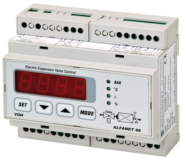 De ALFANET 88 is een regelaar voor het besturen van elektronische expansie ventielen. De uitsturing gebeurd door zowel een modulerende puls/pauze sturing als door een 0/10Vdc P(i) signaal. Hierdoor kunnen kleppen van diverse merken en type’s gebruikt worden.